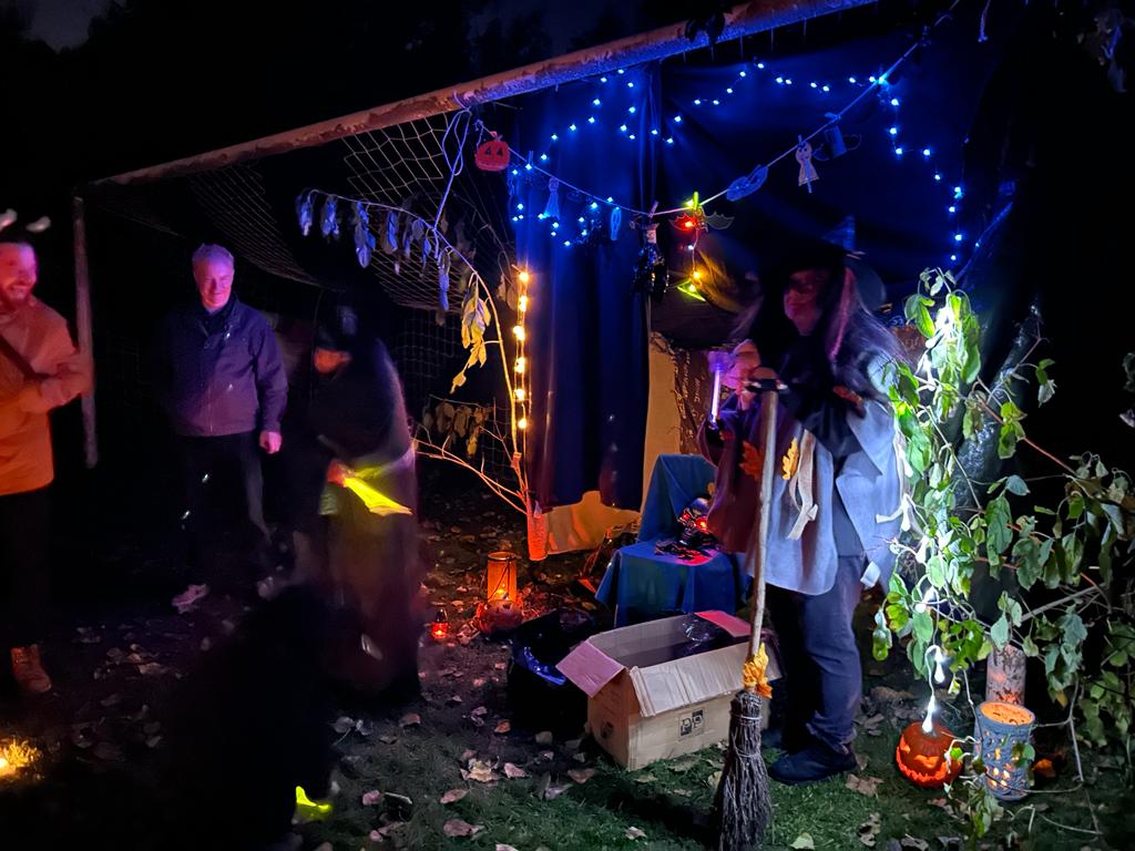 Naše cesta pokračovala směrem nahoru ulicí Viselecká, kolem Radimské pískovny, přes Chotutickou vlakovou zastávku a cestu jsme ukončili na místním sportovním hrišti. Všichni děti společně se svými rodiči i prarodiči zvládly stezku na výbornou. A tak pro ně byla připravena odměna, pro kterou si ale museli dojít do strašidelné jeskyně, kde jim naše hodná čarodějnice rozdala za odměnu balíčky se sladkou odměnou. Na úplný závěr si všichni naši účastníci mohli zakoupit něco dobrého k jídlu a teplý nápoj pro zahřátí.